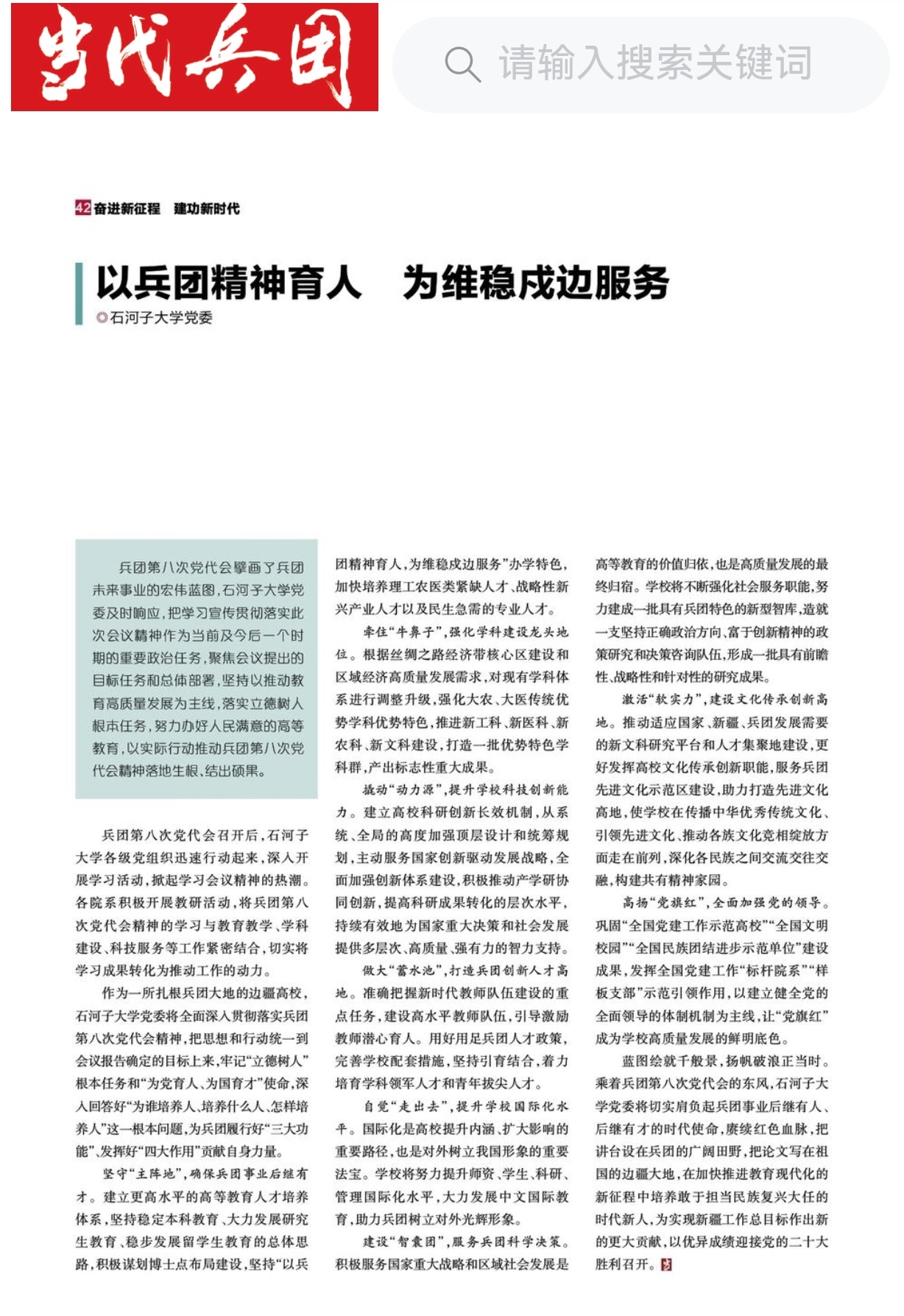 作为一所扎根兵团大地的边疆高校,2023白菜网总站大全党委将全面深入贯彻落实兵团第八次党代会精神,把思想和行动统一到会议报告确定的目标上来,牢记“立德树人”根本任务和“为党育人、为国育才”使命,深入回答好“为谁培养人、培养什么人、怎样培养人”这一根本问题,为兵团履行好“三大功能”、发挥好“四大作用”贡献自身力量。