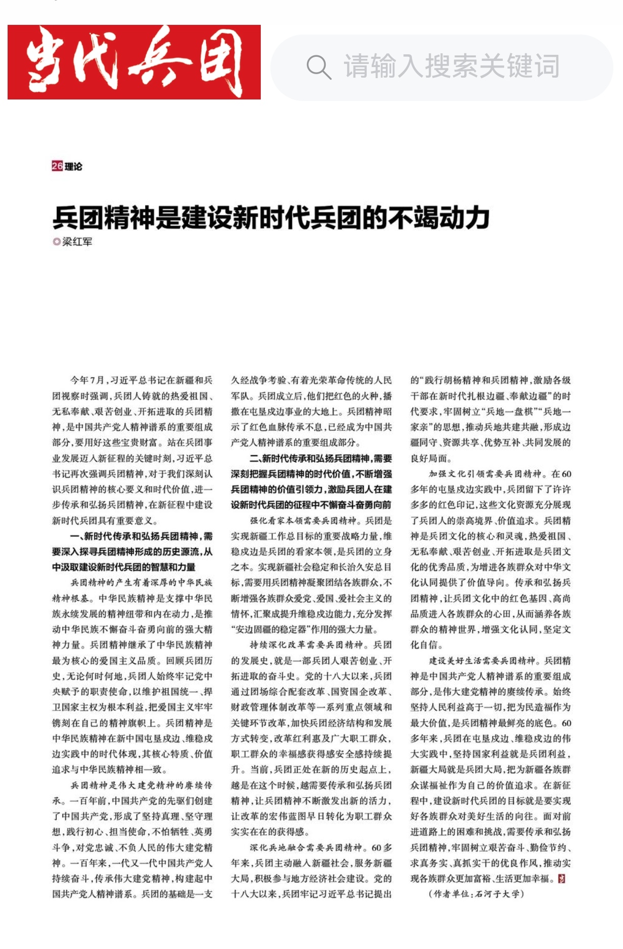 今年7月,习近平总书记在新疆和兵团视察时强调,兵团人铸就的热爱祖国、无私奉献、艰苦创业、开拓进取的兵团精神,是中国共产党人精神谱系的重要组成部分,要用好这些宝贵财富。站在兵团事业发展迈入新征程的关键时刻,习近平总书记再次强调兵团精神,对于我们深刻认识兵团精神的核心要义和时代价值,进一步传承和弘扬兵团精神,在新征程中建设新时代兵团具有重要意义。